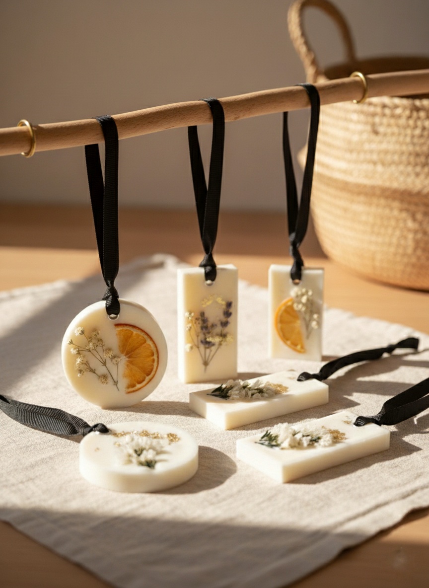 Estas delicadas piezas de cera de soja, bellamente decoradas con elementos botánicos naturales, son la forma ideal de infundir una fragancia suave y constante en tus armarios, cajones o cualquier pequeño rincón. Su diseño artesanal no solo perfuma, sino que también añade un toque decorativo y personal a tu hogar.
